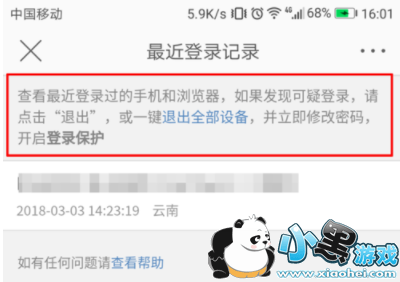 6.如果大家发现自己的帐号存在风险,大家就可以按照这里的提示,点击“一键退出全部设备”,然后马上修改自己的密码。
