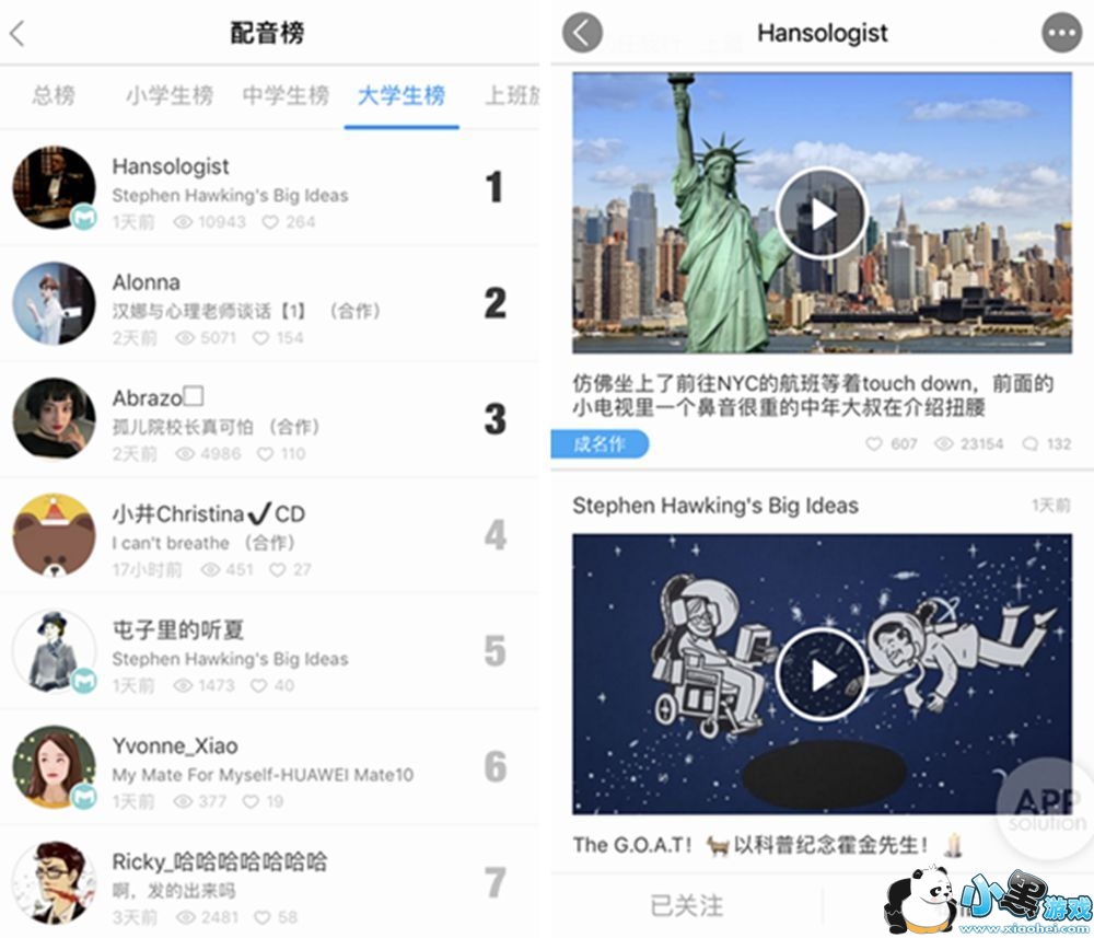 值得一提的是,《英语魔方秀》设置了「配音榜」,有大学生榜、高中生榜等,不仅可以发现很多配音大神,还能自己对比一下与我们同年龄段人的配音水平哦!
