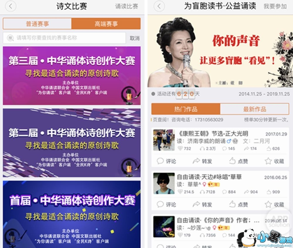 点击「榜单」可以看到许多活动,如主播大赛、诵体诗大赛,更有「为盲胞读书」等公益诵读活动。