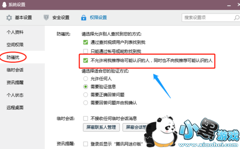 4. 勾选以后关闭此窗口,返回到QQ聊天面板,我们此时会发现系统不会再推荐可能认识的好友了;当然如果是最新的QQ9.0版本还有更快的设置方法,那就是在好友推荐的右侧点击"更多",然后在弹出的验证消息界面点击"好友验证方式设置",此时同样可以弹出防骚扰设置窗口哦。