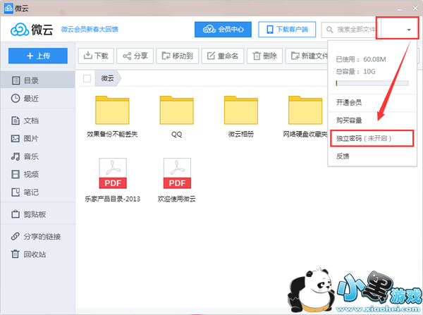 4.我们进入主题,打开微云之后,点击右上角的头像旁边的小箭头,如图,下拉菜单,点击独立密码,如图。