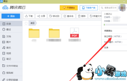 4.打开微云之后,点击右上角的头像旁边的小箭头,下拉菜单,点击独立密码。