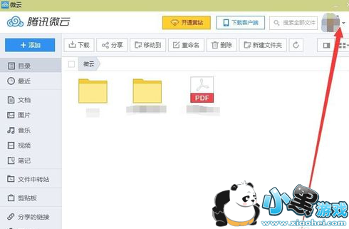 2.第二步,来到微云界面,点击右上方头像旁边的选项点。如下图红箭头指向位置。