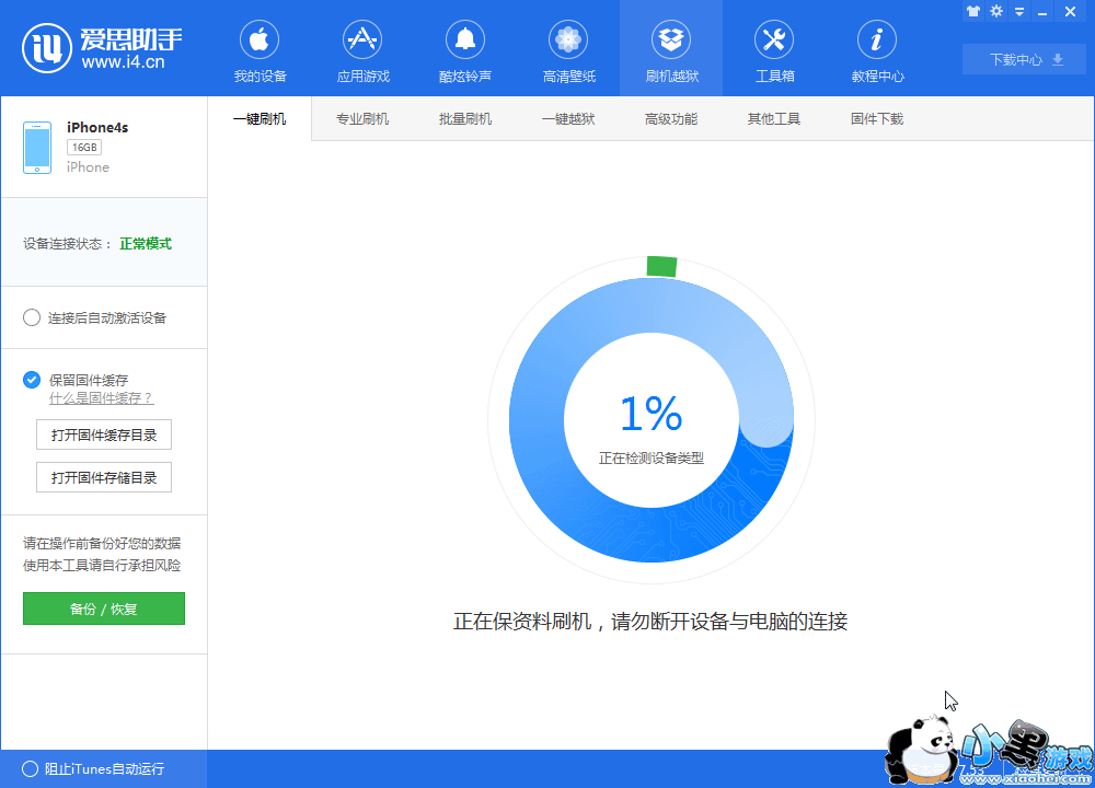 连接后点击上方“刷机越狱”进入到“一键刷机”界面,这里会根据你的手机自动匹配可刷固件;