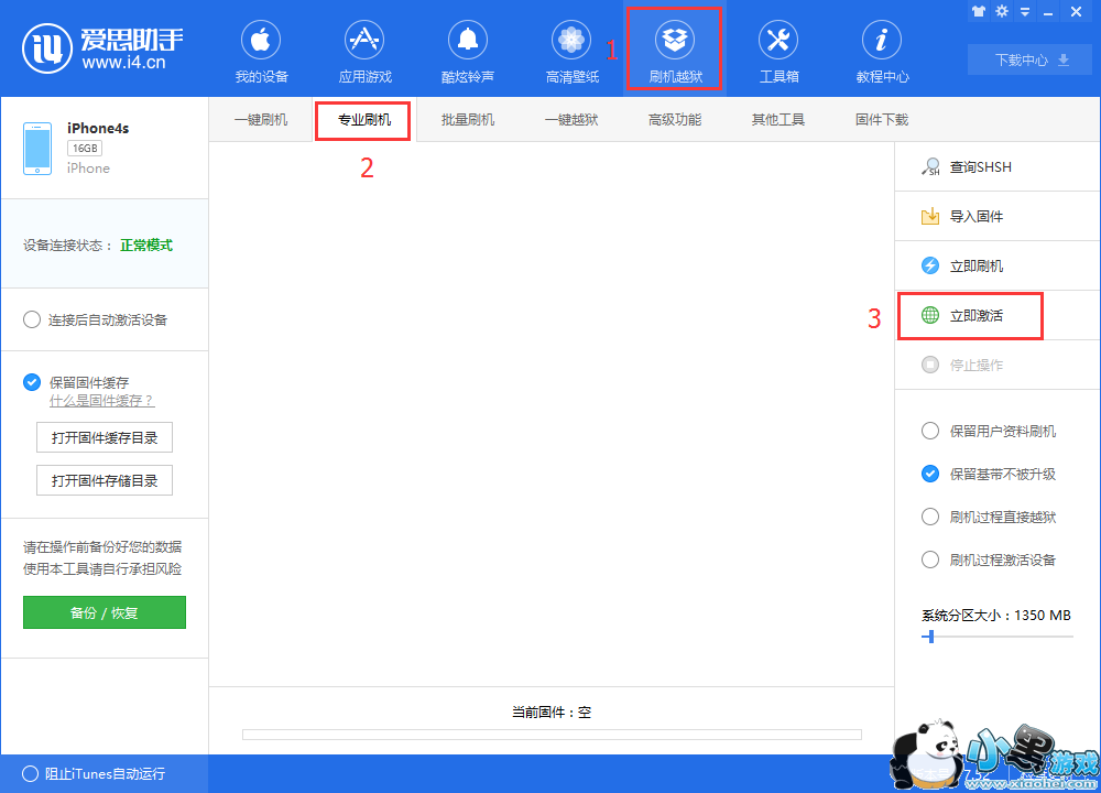 在电脑上下载并安装爱思助手最新版,打开爱思助手并用数据线将设备连接电脑;点击“刷机越狱 --> 专业刷机 ”,再右边点击“立即激活”。