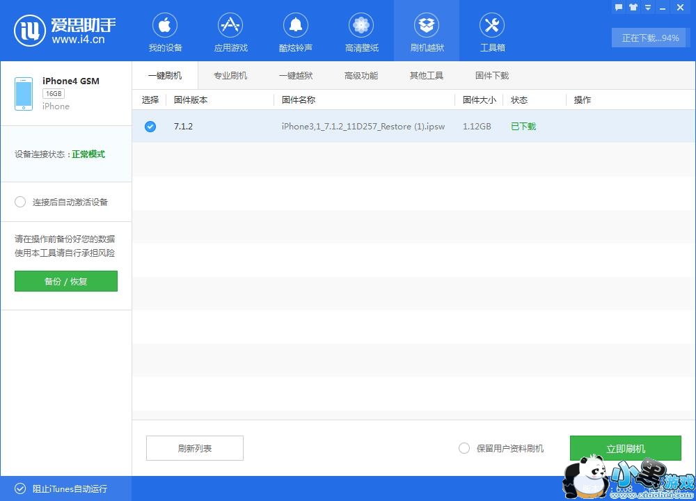 2.设备连接爱思助手,爱思助手会根据你的设备自动匹配可以刷的固件,如下图,我们选择“7.1.2”版本固件,在“连接成功自动激活设备”和“保留用户资料刷机”这两项都打勾后,点击“立即刷机”;