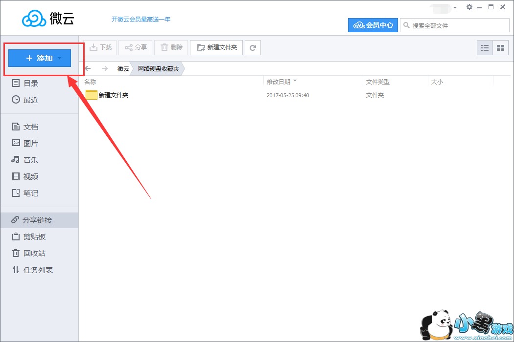 1、首先我们打开腾讯微云客户端,然后在其左上角找到“添加”按钮,注意这里不要点它,放在上边即可