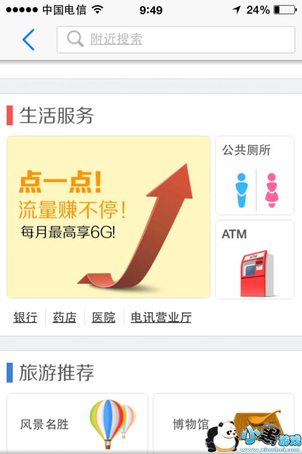 打开高德地图,在屏幕底部选择“附近”,进入“附近”界面,向下拖拽找到“生活服务”,如图2所示,点击“点一点”,如果是江苏、浙江、广东、湖南四省的电信用户,可以直接点击“参加活动”按钮领取流量,每天都有一次点流量的机会,流量包为30M-200M不等,首次点击100%中奖,之后每天的中奖概率为50%,其他省的用户可以在获得流量之后,赠送给使用四省电信手机号码的亲友。