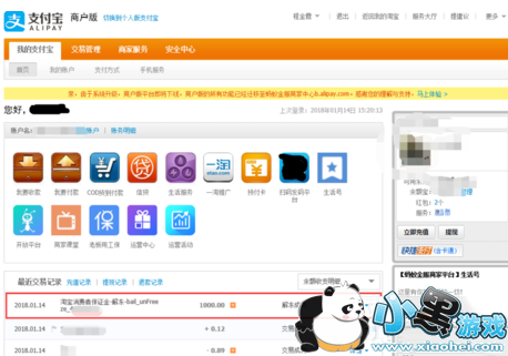 8. 点击“我的支付宝--首页”就可以看到1000元保证金已经到账支付宝余额。