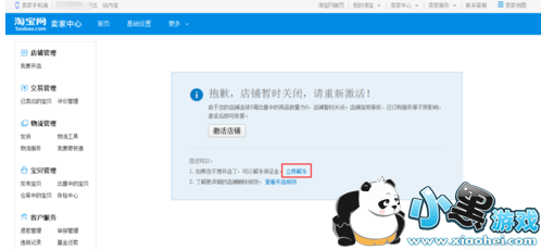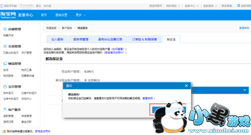 2. 进入卖家中心以后我们发现淘宝提示我们不想开店了,可以解冻保证金,我们直接点击“立即解冻”。如何店铺没有提醒可以点击“客户服务--淘宝服务”,就可以看到保证金的页面了;