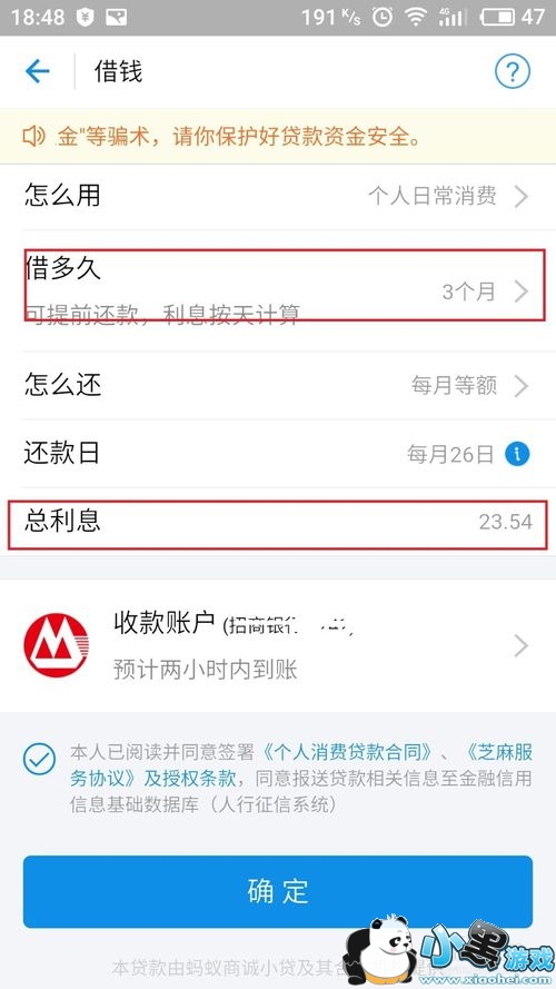 4、择借钱的数目,然后设置收款账号和还款账户,一般最长是可以借钱一年,12个月进行还款。设置完成点击确定使用。