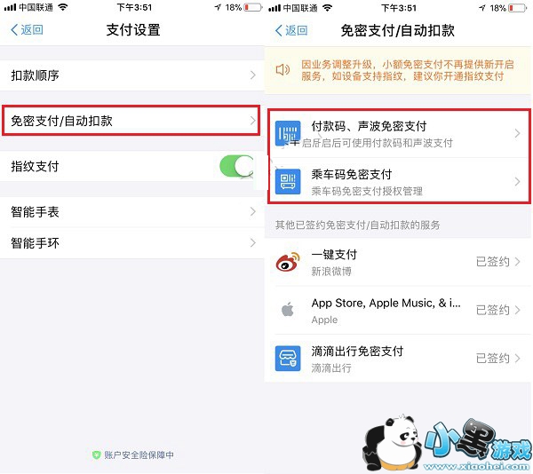 二、在支付设置中,点击进入「免密支付/自动扣款」选项,然后就可以对一些支付场景的自动扣费服务进行开启或关闭操作了。
