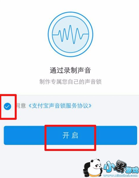 4.在声音锁界面点击勾选服务协议,然后点击【开启】。