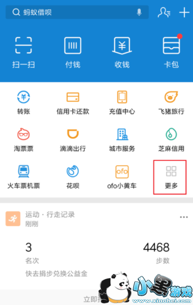 2.我们点击进入支付宝主页,然后点击主页的那个更多标志如图所示