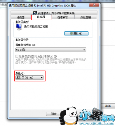 务必保证监视器内的颜色一栏为“真彩色(32位)”,这样才能启用WIN7的AERO效果。