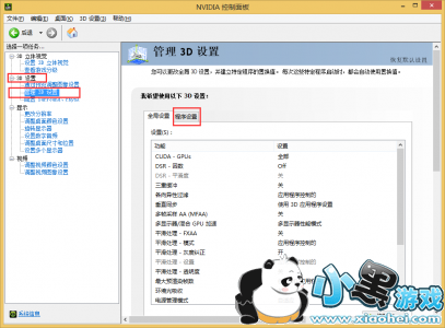 2. 选择"3D设置"里的"管理3D设置",然后点击框选中的"程序设置";