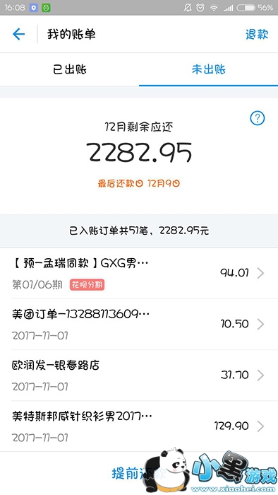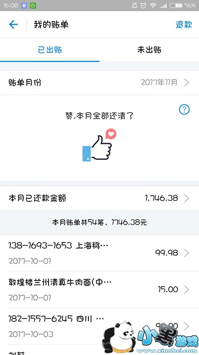 3、这时候将会出现“已出账单”和“未出账单”,当期的直接选择还款就行了,未出账单会在每个月的1号进行结算,当然也可以选择提前还款。