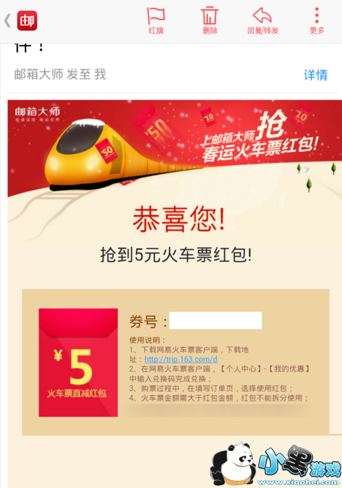 4.火车票红包以后,系统会给你所添加的邮箱地址发送邮件,告诉你火车票红包的兑换码,大家赶紧登陆邮箱大师查看兑换码吧。