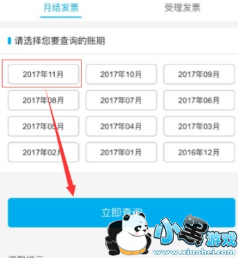2.在“电子发票”中可以看到两项,月结发票和受理发票,这里报销的话当然是需要打印月结发票,选择需要打印的月份,点击“立即查询”。