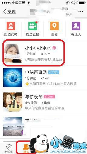 2.点击下面一排的“遇见”,再点击个人头像,如图: