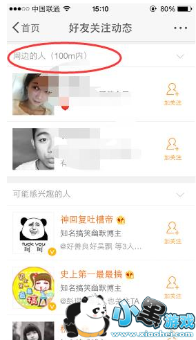 2、点击以后,我们可以直接看到周边的人,而且还有距离显示哦!大家可以点击他们的头像观看微博主页里的微博;