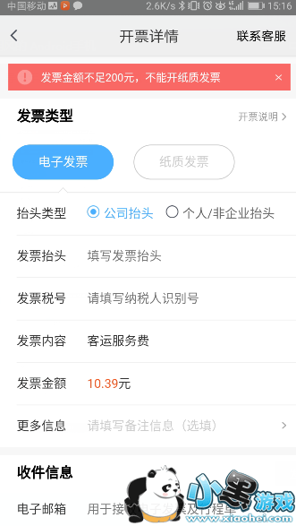 3、在这里填写相关的信息就可以开发票了,需要注意的是金额满200元才可以开纸质发票。