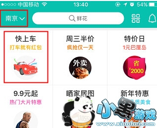 登录美团手机APP,因为现在只能在南京地区使用此功能,所以我们选择南京区域,然后我们就可以看到“美团打车”入口(如图)。