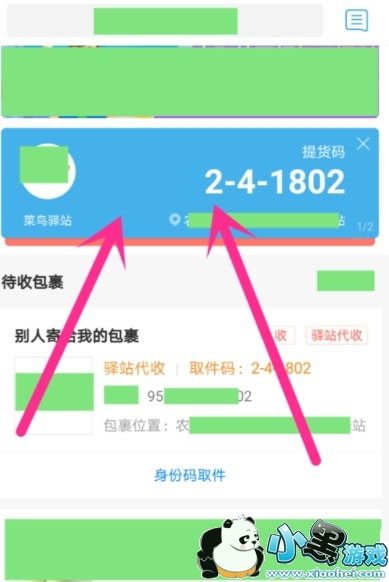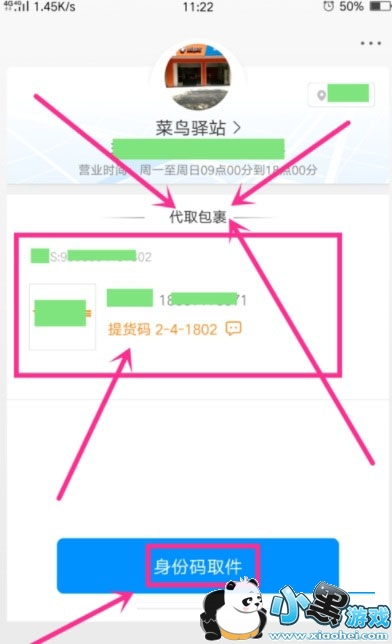 7.然后你的好友打开他的菜鸟裹裹APP就可以看到你的快递代取信息,然后他使用自己的“身份码取件”即可,无需签名就可以取件。如图所示
