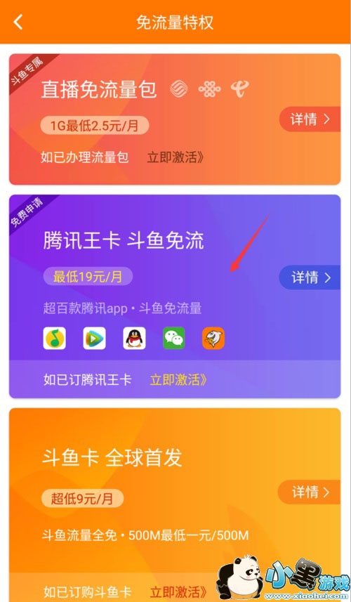 3.打开免流量特权页面后,我们可以看到有三种方式让我们看斗鱼直播免流,我们点击选择腾讯大王卡