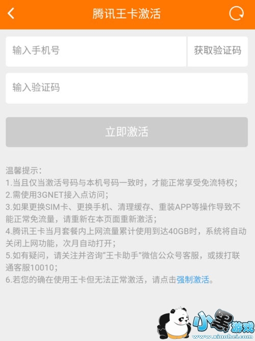 4.输入你的手机号码(当然必须是腾讯王卡)啦,然后获取验证码之后点击激活