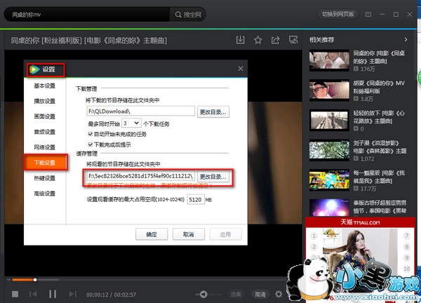 4、在“设置”中选择“下载设置”,查看如下图所示的视频播放缓存记录存储位置,并通过电脑找到此目录。
