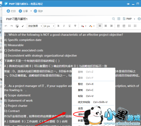 3.或者在全选笔记内容后, 鼠标右击打开菜单,选中清除格式菜单项也可以清除笔记的格式。