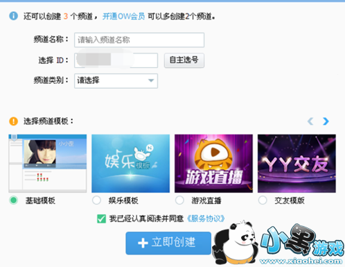 ID选好后,再在下方的频道类型点击选择一下,频道类型选好后,最后点击“立即创建”按钮即可。