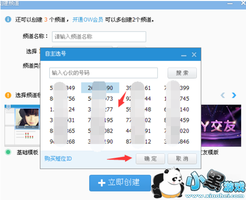 接着,就是选取频道ID,可以用系统默认的,当然也可以点击“自主选号”按钮,然后在自主选号窗口中搜索找到自己喜欢的ID,点选它并按下方的确定即可。