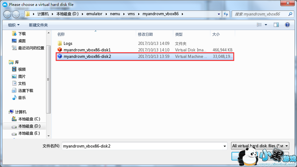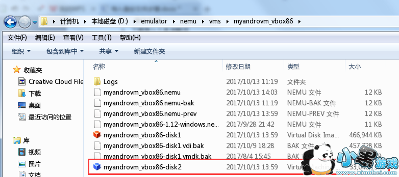 6.打开myandrovn-vbox86文件夹,可以看到里面的-disk2文件依然存在,但跟模拟器的链接已经被移除了,删除该文件,并复制所需的-disk文件到该文件夹中
