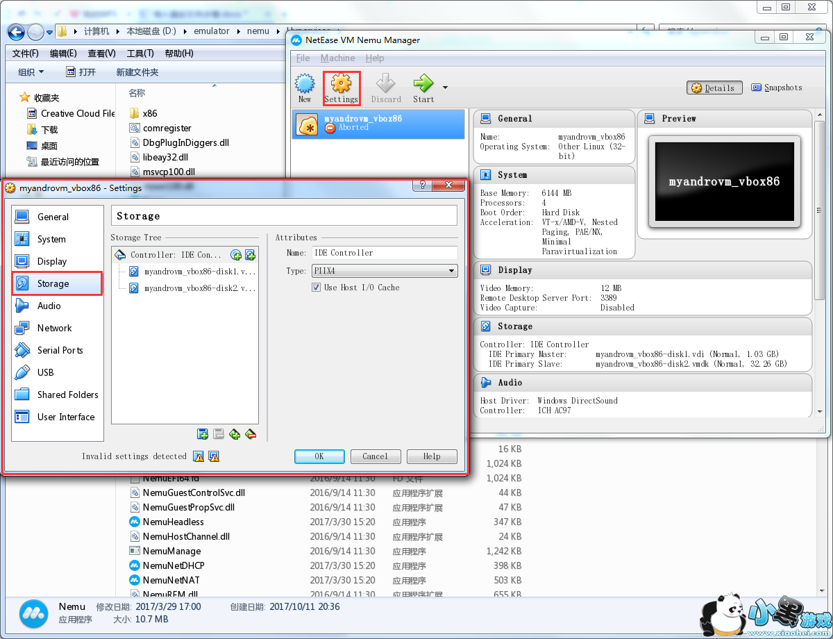 4.打开Nemu应用程序(上图红框程序),打开之前请确保MuMu模拟器已经关闭,点击setting出现新的setting窗口,选择storage