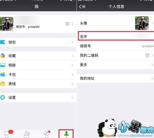 3、在手机中打开微信,然后切换到“我的”界面,点击自己头像进入个人设置,然后点击“名字”就可以修改昵称了!
