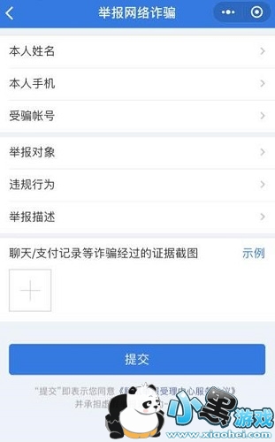 4、填写姓名、手机号码、受骗账号、举报对象等信息,并按“提交”即可;
