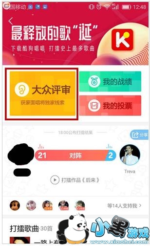 2、找到“大众评审”版块,进入即可当大众评委,并开始投票。PS:哪怕不唱一首歌,只当评委也是有等级的呢。而且,在当评委投票的过程中,系统会随机给你派发各种礼物哦。