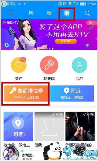 1、打开酷狗音乐app,找到“唱”版块里的“蒙面排位赛”,点击进入。