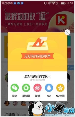 7、分享给好友后,好友会收到你的“快来找好友歌声”的邀请,然后酷狗会随机安排十组对阵选手,好友需在10组对阵中找到你唱的歌,然后再给你投票。这个小编亲测过,发现几乎没什么用,好友根本就找不到你啊。