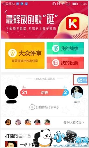 6、在对阵列表右上角有个“分享”按钮,点击即可邀请微信、QQ、微博好友为你投票助阵,但酷狗规定:好友最多可支持3票。