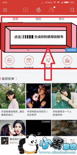 1、大家将自己的网易云音乐更新到最新版本,打开软件,看到首页“独家策划”,生成你的使用说明书,点击进入;