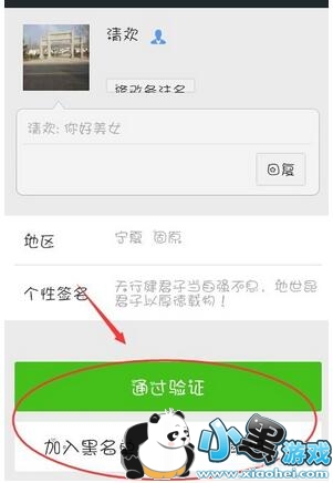 6、如果有想加好友的人,打开他,选择通过验证,如果经验骚扰你,可以加入黑名单