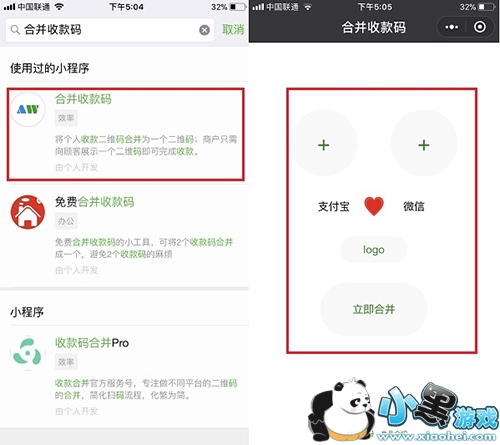 打开微信,然后在【发现】中,打开【小程序】,然后搜索【二维码合并】或【合并收款码】,就可以找到一些免费二维码合并工具,以合并收款码小程序为例,只要点击+号,然后使用相机扫描上面制作好的二维码,依次完成支付宝和微信二维码添加,然后点击“立即合并”就可以了,如下图所示。