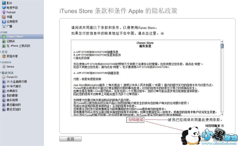 第四步,在看过Itunes store条款和条件apple隐私政策后,在“我已经阅读并同意此使用条款”前打钩,并按“继续”;