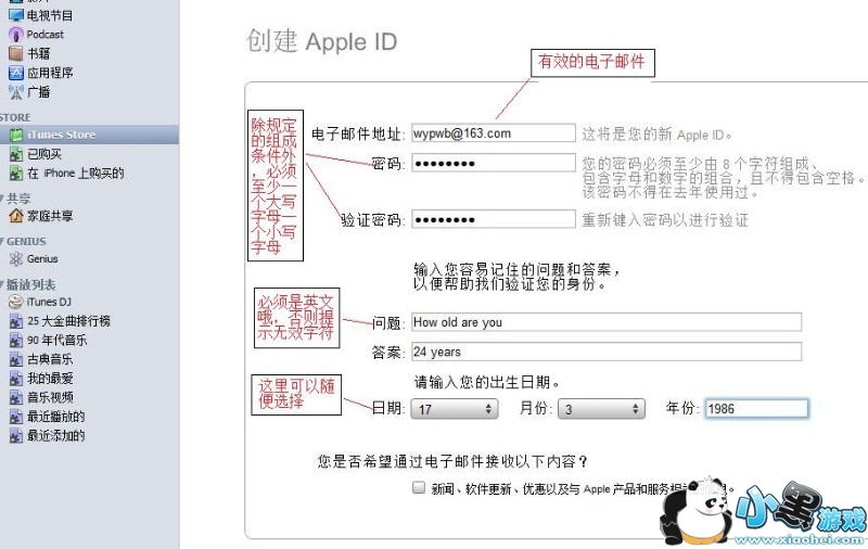 第五步,进入相关信息录入窗口后,需要注意的是:“电子邮件地址”一栏必须填写真实的你的邮箱,这个牵扯到所有信息录入后,苹果公司会验证你的邮箱地址的正确性,你会在你的邮箱中收到其所发来的验证邮件,点击后方可激活你的“apple ID”。