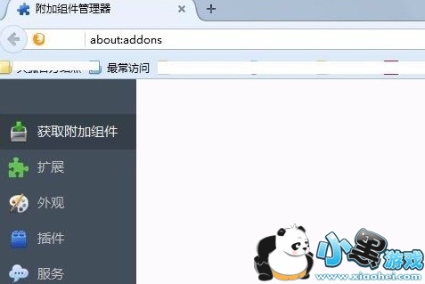 第四步,点击【附加组件】后,窗口切换到【附加组件管理器】窗口界面,默认进入的是【获取附加组件】,在这里选择作侧【获取附加组件】下方的【扩展】标签。