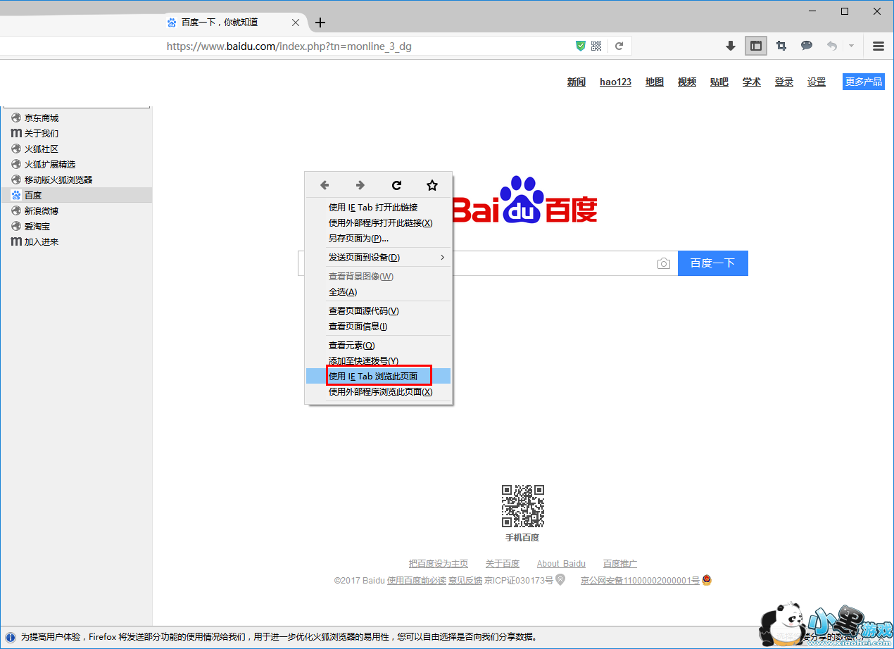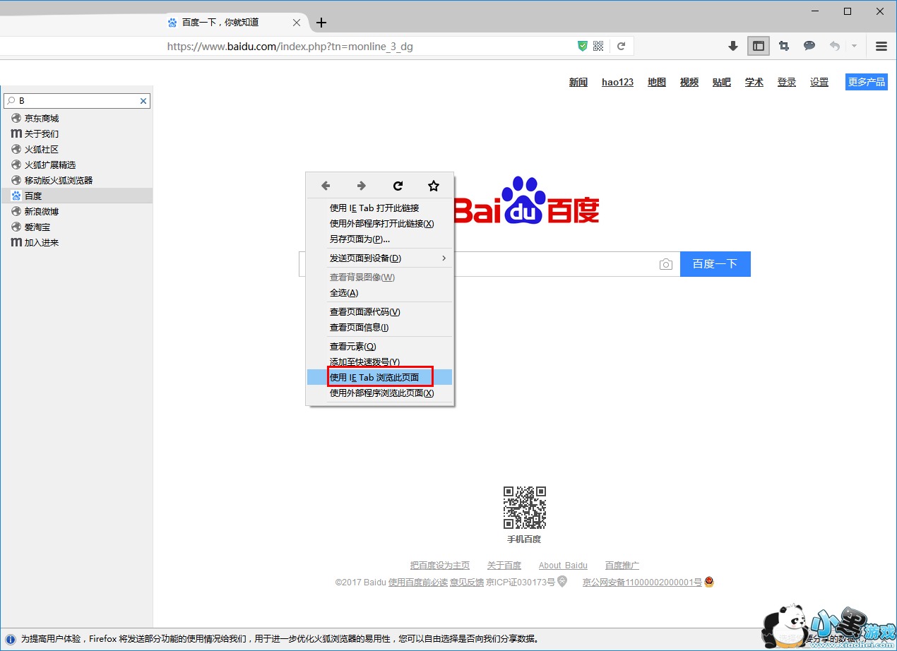 6、重启后,我们打开无法被打开的网页,然后鼠标右击界面空白处,在呼出的选项中选择“使用IE Tab浏览此页面”。