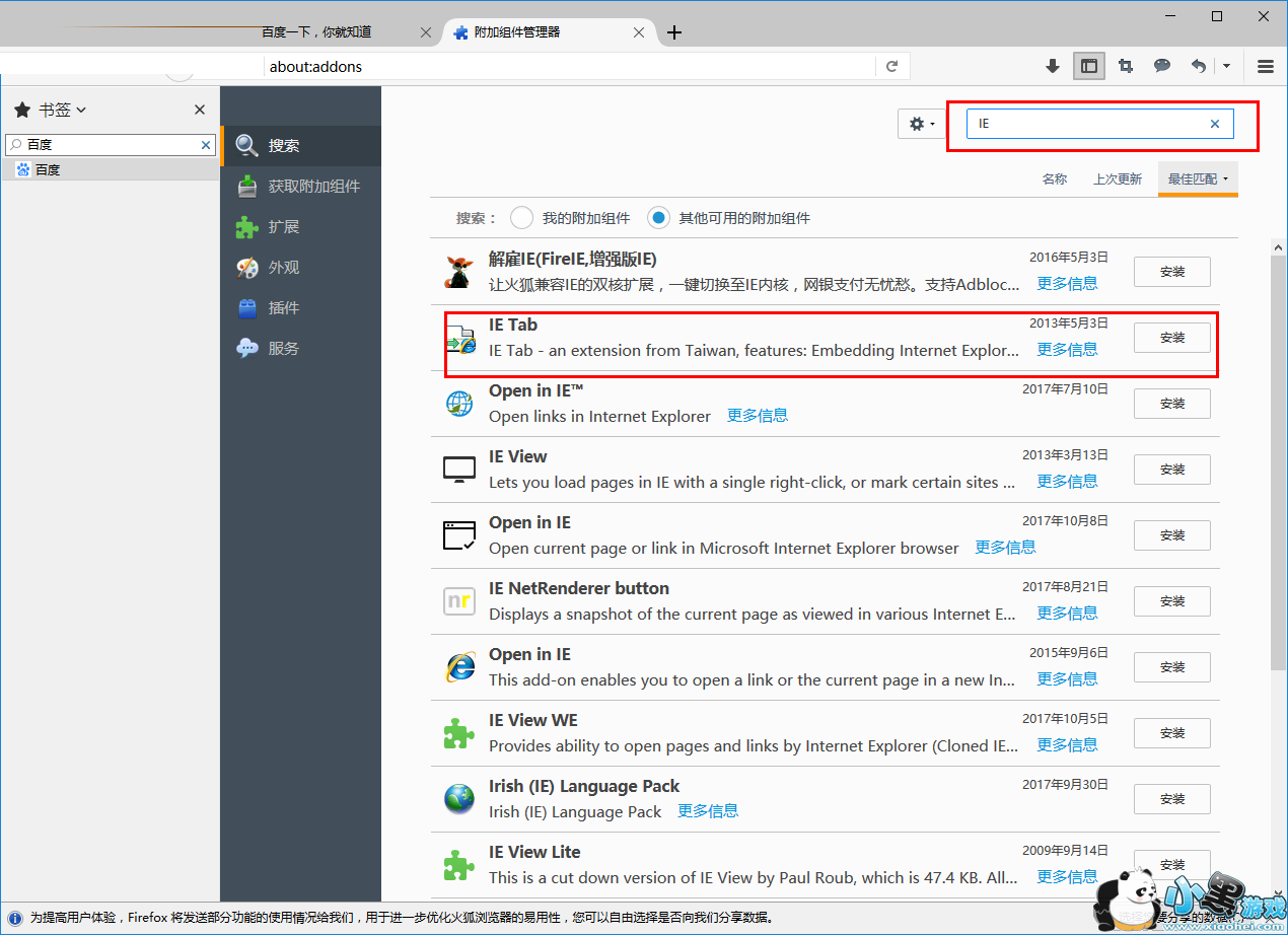 4、然后在搜索框中输入IE tab,然后安装一款名为IE Tab的插件。
